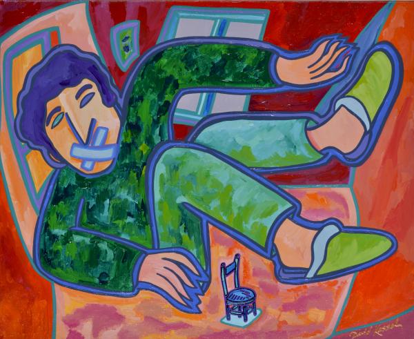 S’envoler, s’évader, chaussé de pantoufles de sept lieues : un rêve… Mais dans mon cauchemar le plafond est trop bas, les murs étroits et l’air manque. La chaise me rappelle à elle, je ne la vois que trop. Elle me souffle son cruel sarcasme : « Je sais que tu vas redescendre, Icare, c’est le prix à payer quand on se brûle les ailes ».