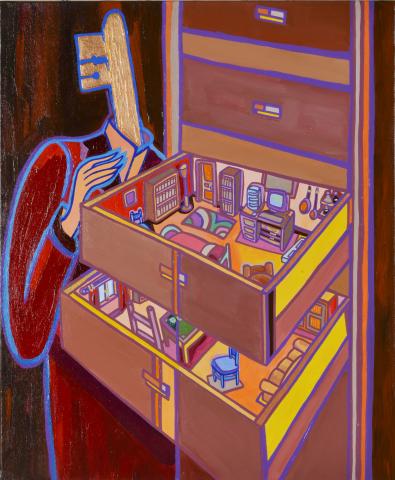 L’homme à la tête de clé, Des vies bien rangées dans le secrétaire ? D’ailleurs, est-ce un homme, il a une main gracile ? Et le col de son costume semble être un livre ouvert, ou un cahier ?