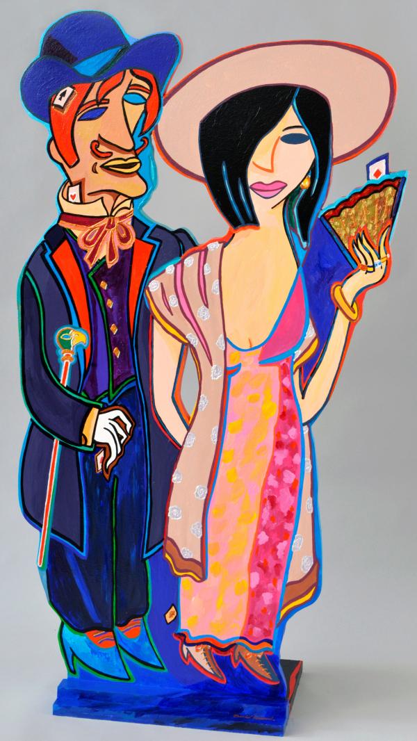"Couple de tricheurs "recto. Acrylique sur bois découpé. 134 x 72 x 35 cm